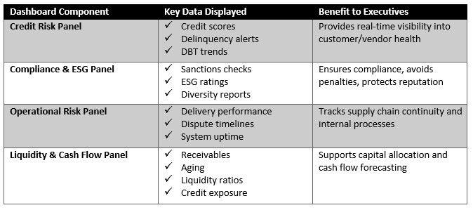 How do C-Suite executives use financial risk dashboards? Dashboards consolidate KPIs across credit, compliance, and operations. They provide alerts, highlight emerging risks, and enable proactive intervention before disruptions occur.