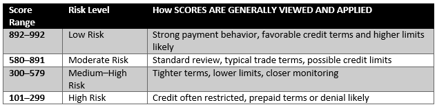 Credit scores take into account a wide range of indicators to evaluate risk. Unlike consumer credit scores, they use different scoring models, data sources, and ranges, and they are interpreted within a commercial risk framework.