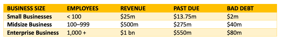 Think about those numbers for a minute. That means for a company earning $5 million in revenue annually, more than $2.75 million is already beyond the due date and $400,000 each year is bad debt. When you apply the median formula Gartner uses to classify business sizes, the average numbers are staggering.