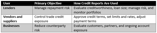 Business credit reports support different decisions depending on who is reviewing them. While the data may be similar, the objectives and interpretation will vary depending on use.