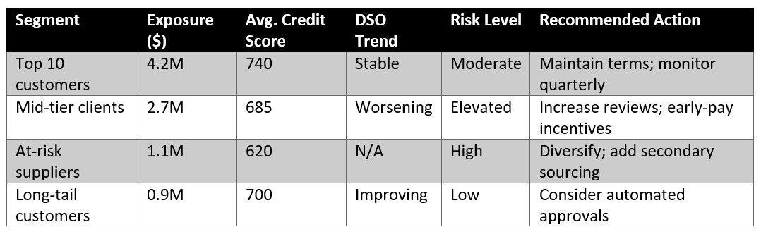 Credit portfolio management gives executives a holistic view of exposure across customers, partners, and vendors. Instead of treating accounts in isolation, you see correlations and concentrations: which industries dominate your AR, which regions share economic risk, which suppliers form single points of failure.